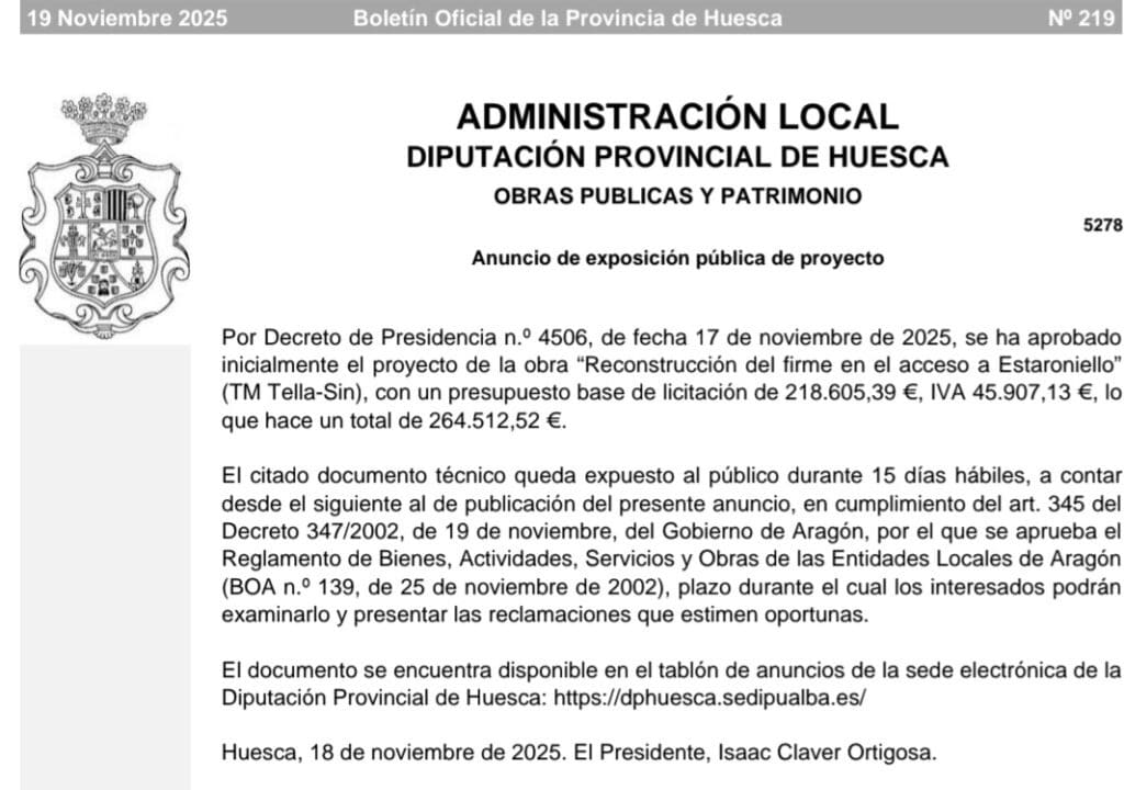 El año 2025 terminó con una buena noticia, y es que la DPH publicó la convocatoria para el asfaltado de la Pista de Mirabal, así que en éste 2026 los dos núcleos del municipio de Tella-Sin verán mejorados significativamente la seguridad vial y la comodidad de sus vecinos y visitantes que transitan por esta vía.